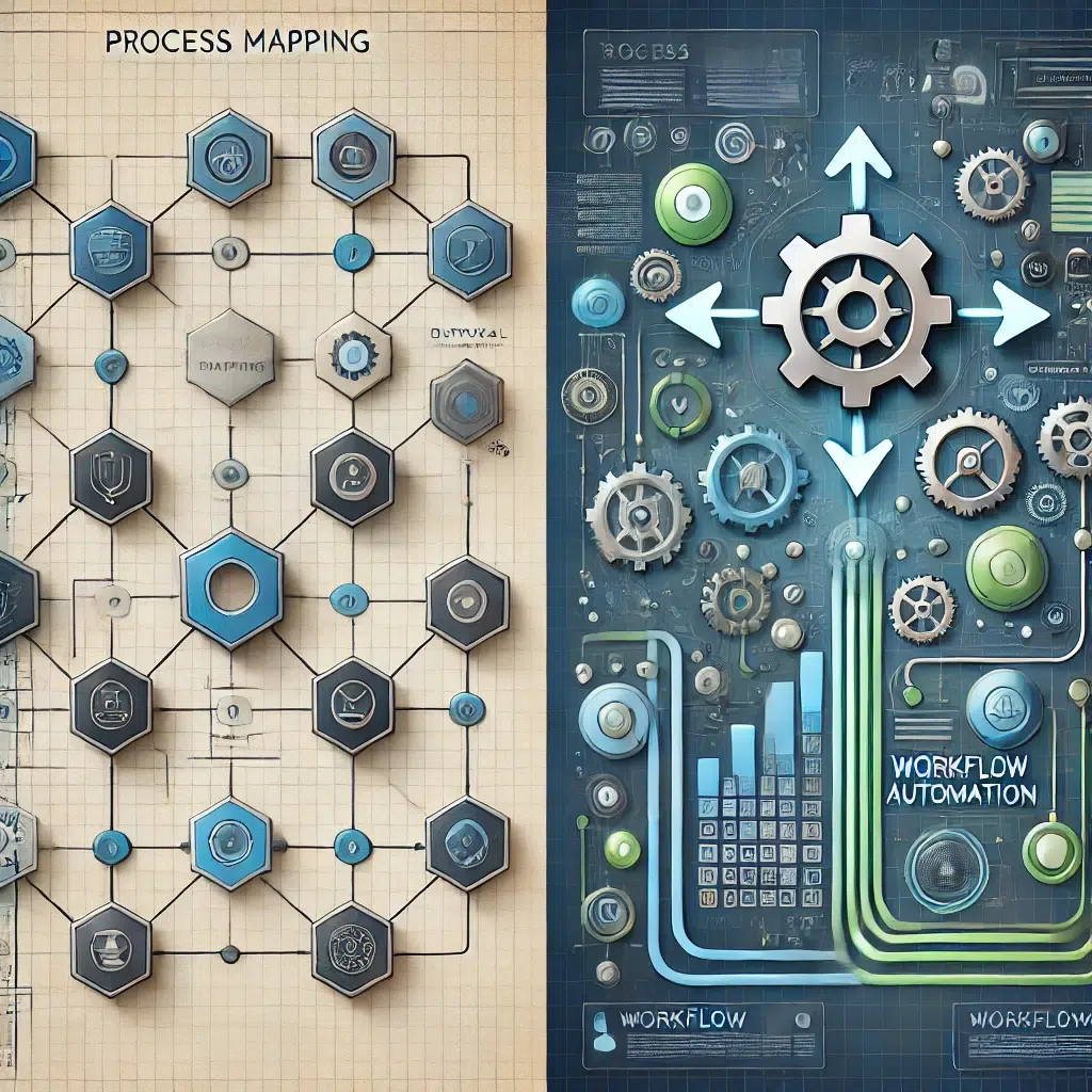 A side-by-side comparison showing a process mapping flowchart with manual steps versus an automated workflow system with interconnected gears and streamlined arrows, illustrating their differences.