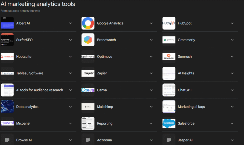 Example: Google Analytics 4 (GA4) with AI features, Tableau, and Power BI.